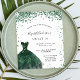 A modern, stylish and glamorous invitation for a Sweet 16, 16th birthday party. On the front: A white background with green sparkles, an emerald green dress. The name is written with a modern hand lettered style script. Personalize and add your party details.