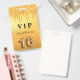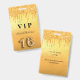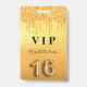 A modern, stylish and glamorous badge for a Sweet 16, 16th birthday party. A fauc gold metallic looking background with faux glitter drip, paint dripping look. The name is written with a modern hand lettered style script. With the text: VIP Number 16 is written with a balloon style font, script.