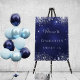 A welcome board for a girly and glamorous Sweet 16, 16th birthday party. A navy blue background with elegant faux silver glitter sparkles. The blue color is uneven. Personalize and add a name. White letters.