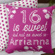 Pink Sweet 16 birthday commemorative throw pillow has darling white wild flowers and pink polka dots on the back. Easily change the purple background color to any other color that perfectly matches your Sweet 16 theme. White font and white wild flowers can also be changed to any color. Versatile for magenta, violet, hot pink color palettes.