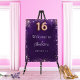 A welcome board for a girly and glamorous Sweet 16, 16th birthday party. A deep purple background decorated with faux glitter, sparkles. The purple color is uneven. Personalize and a name.