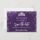A glamorous Save the Date card for a Sweet 16, 16th birthday party. A purple uneven colored background. Decorated with faux silver glitter sparkles and a tiara. The text: Save the Date is written with a large trendy hand lettered style script.