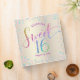 “Happy Sweet 16”. Let your favorite Sweet 16 birthday girl celebrate her milestone with this stunning keepsake scrapbook memory album. Rainbow glitter script typography, along with festive turquoise, purple pink and gold confetti, overlays a champagne gold foil metallic background. More brushed gold foil and pastel confetti dots are on the back. Personalize the custom text with the birthday girl’s name and birthday date. Great for the budding fashionista who loves modern glitter and glam! Matching invitations, thank you cards, plates, napkins and other birthday goodies are also available in this trendy and special collection.