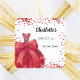 For a Sweet 16, 16th birthday party. A white background with red confetti, a dress and a large red bow. The name is written with a modern hand lettered style script. Personalize and add your name and a date.