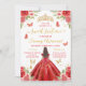 Celebrate her milestone in style with this elegant Sweet 16 invitation featuring a brunette girl in a sparkling red ball gown, viewed gracefully from the back. Surrounded by soft florals, fluttering butterflies, and a regal golden crown, the design blends youthful charm with royal sophistication. The color palette includes bright red, shimmering gold, and soft leafy greens—perfect for spring or summer celebrations. Ideal for princess-themed parties, this invitation sets a magical tone for an unforgettable evening.