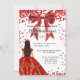 A modern, stylish and glamorous invitation for a Sweet 16, 16th birthday party. A white background with sparkles, a red dress and a red bow. The name is written with a modern hand lettered style script. Personalize and add your party details.