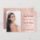 Add a vertical size photo. An elegant rose gold, blush gradient background color, decorated with confetti, sparkles. Personalize and add a name and the details.