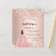 A modern, stylish and glamorous invitation for a Sweet 16, 16th birthday party. A rose gold background with faux gold glitter dust, a girl wearing a ball gown. The name is written with a modern hand lettered style script. Personalize and add your party details.