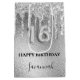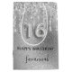 Elegant, classic, glamorous and girly for a Sweet 16, 16th birthday party. A faux silver metallic background. Decorated with faux glitter drips, paint dripping look. Personalize and add a name. With the text: Happy Birthday. The name is written with a modern hand lettered style script. Number 16 is written with a balloon style font.