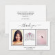 An elegant, simple Sweet 16 Thank You card personalized with your own photo. Add 3 of Your birthday photos, vertical size, a date, name, and the thank you note. A chic white background with black text and a white frame. The text: Thank you on the front and your names on the back are written with a stylish hand lettered script with swashes.