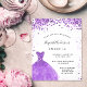 A modern, stylish and glamorous invitation for a Sweet 16, 16th birthday party. On the front: A white background with violet, lilac sparkles, a violet dress. The name is written with a modern hand lettered style script. Personalize and add your party details.