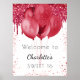 A welcome poster for a girly and glamorous Sweet 16, 16th birthday party. A white decorated with red colored faux glitter drips, paint dripping look, balloons. Personalize and add a name and age.