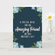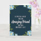 This greeting card features a deep navy background like a calm night sky, with a centered message in crisp white letters that feels like a gentle note between close friends ❤️. Near the top, a short line in simple all-caps sits above the main phrase, drawing your eye downward in an easy flow. The words “Amazing Friend” appear larger in a flowing, cursive-style look, giving the lettering a softer, more affectionate tone without needing extra flourishes. Botanical illustrations frame the design in all four corners, as if the message is being quietly offered with flowers in hand 🌼. Each bloom has pale blue petals with subtle shading and a warm yellow center, while fresh green leaves and thin stems curl inward toward the text. The open space around the wording keeps everything easy to read, while the corner flowers add a tender, companionable feel to the scene. In the corners, the blue flowers and green leaves angle toward the center, with yellow flower centers glowing gently against the dark background.