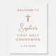 This simple and stylish, faux rose gold and white religious First Holy Communion party welcome sign features whimsical, vintage style script typography and a faux rose gold cross. An elegant, classic minimalist look that is still unique and contemporary.