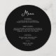 This simple and stylish, dark black round wedding menu cards feature whimsical, vintage style white script typography. Add your dinner choices for starters or appetizers, first course, main course or entrée, and desserts. An elegant, classic minimalist look that is still unique and contemporary and is perfect for either your wedding reception or rehearsal dinner, or bridal shower or couples shower food offerings.
