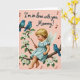 This design shows a storybook-style scene with a cherubic child perched on a sturdy flowering branch, golden curls spilling around a small face and soft white wings tucked behind. The child wears a pleated sky-blue dress with a lace collar, and a faint blush on the cheeks suggests a shy, affectionate mood ❤️. The branch curves like an arch and is covered in white blossoms with sunny yellow centers, surrounded by deep green leaves that frame the figure. Three blue birds with red beaks share the space, with two snuggled close together as if keeping each other company while the third watches from the other side. A slender dark wand rests in the child’s hand, angled outward like a gentle invitation to join in the quiet moment. Near the top, a line of flowing text appears in a dark ink tone, standing out clearly against the soft blush-pink background. Small musical notes float around the scene, and a few sit near the upper area beside the text 🌼.