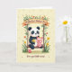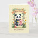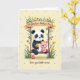 Designed with two sweet animal friends sitting close together on a rustic wooden swing, this card sets a gentle, affectionate scene ❤️. A black-and-white bear-like character with dark eye patches and ear markings holds a small bouquet of bright yellow flowers, angled toward its companion as if offering it with a shy, caring glance. Next to it, a rosy piglet-like character wears a cheerful yellow bow and leans in slightly, adding to the sense of closeness and friendship. The swing frame is wrapped in leafy green vines and clusters of orange and yellow blossoms, like a garden arch surrounding them. Near the top, a curved banner stretches across the background with a short message in dark lettering, and below the illustration a second line of text appears in a smaller, matching color. At the bottom, a tiny round pink character stands near the swing base, adding a small, sweet detail 🌼. The background is a creamy yellow with scattered warm-toned dots, and the flowers around the swing show orange and yellow petals with green leaves curling along the wood.