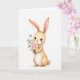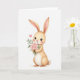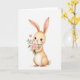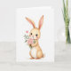 This card features an anthropomorphic long-eared creature centered on a bright white background, keeping all attention on its gentle pose 🐰. Its fur is shaded in warm cream with soft tawny browns, giving it a cozy, touchable look with smooth lighting and almost no shadow. Large dark eyes with a tiny sparkle meet the viewer like a shy friend, and the slight tilt of its head adds a quiet, affectionate tone. A small pink nose and faint rosy cheeks suggest a bashful, romantic warmth, as if it’s holding back a grin. The tall ears stand upright with pale pink inner details that echo the soft blush on its face. Cradled close to its chest is a small bouquet of pink blossoms with fresh green leaves, like a sweet offering for someone special 🌷. A short greeting appears near the top in light pink lettering, while a small pink heart floats just to the side of its head.