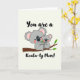 Designed with a sweet, cozy mood, the artwork shows two small gray tree-dwelling animals cuddled close on a thin brown branch, their bodies leaning together like close friends ❤️. A larger figure wraps its arms around a smaller companion, and their gentle cheek-to-cheek pose suggests affection and care. Both have soft gray fur, pink inner ears, and light rosy cheeks, with big glossy black eyes and rounded noses that make their expressions look tender. The background is a light creamy tone, leaving lots of open space so the pair stands out clearly. At the top, a short line of text sits centered in a dark gray, flowing handwritten style, like a quiet compliment. At the bottom, another centered line in the same dark gray style adds a cute word twist that nods to the animals, giving the scene a friendly, loving feel 🌼. Small green leaves sprout from the branch around them, framing the cuddle with simple natural details.
