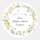 Bee-themed Wildflower baby shower sticker featuring a delicate watercolor wreath of greenery and yellow wildflowers with buzzing bees. Personalize with your information or click "Click to customize further" to edit font styles, size and colors.