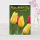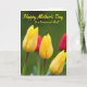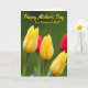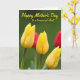 This card features three yellow tulip buds in the foreground, their petals tightly closed with fine vertical lines that catch the light like a gentle wink of affection ❤️. Deep green stems rise beneath them, slightly darker near the base, giving the flowers a grounded, steady look. Behind the tulips, the background fades into a soft, out-of-focus field of rich green that feels calm and intimate, like a quiet garden moment shared with someone close. Off to one side, a blurred touch of warm red suggests another flower nearby, adding a subtle contrast that feels like a friendly presence 🌼. Across the upper portion, the message “Happy Mother’s Day to a treasured Aunt” is placed as an overlay in a flowing, cursive-style font. The lettering is a bright yellow that echoes the tulips, standing out clearly against the darker greens. The words sit centered near the top, with the tulips clustered below, and a faint crimson blur peeks near the edge of the green background.