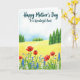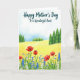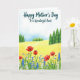 Designed with a serene outdoor scene, this digital illustration opens on a dense carpet of wildflowers that feels like a gentle hug between close family members ❤️. In the foreground, several large red blossoms with soft, unfurling petals take center stage, surrounded by smaller blue and white flowers that nestle together as if keeping each other company. Behind them, a golden meadow stretches across the middle of the card, with fine strokes suggesting grasses leaning in the same direction like friends walking side by side. A dark green row of simplified evergreen trees anchors the horizon, contrasting calmly with the pale blue sky above. The light looks warm and diffused, giving the whole landscape a tender, early-summer glow 🌼. Across the upper portion of the scene, the message “Happy Mother’s Day To a Wonderful Aunt” appears in flowing teal lettering, standing out clearly against the sky and treetops. The red blooms sit low in the composition, while the blue and white flowers scatter outward to the edges like a natural frame.