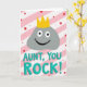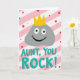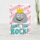 This card shows a smooth gray, pebble-shaped character near the top, wearing a shiny golden crown that adds a sweet, admiring tone ❤️. Its face is simple with two wide white eyes, small black pupils, and a big curved black smile that feels like a friendly grin aimed right at the reader. The character’s rounded shape and relaxed expression suggest an easy closeness, like a warm inside joke shared between family or close friends. Centered below the character, the text reads “AUNT, YOU ROCK!” in rounded teal letters that stand out clearly against the background. The words sit in the middle-lower area, spaced evenly, with the teal color echoing the upbeat mood without being loud. Behind everything, the background is filled with diagonal stripes that alternate soft pink and white, giving the scene a gentle, celebratory energy 🌼. Small red dots, scattered like confetti across the stripes, add extra texture and motion around the crown and lettering. The crown is a bright yellow-gold with simple points, sitting squarely on the character’s head against the pink-and-white striped field.