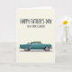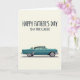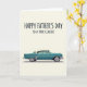 This design shows a mid-century style coupe stretching across the lower half of the card in a crisp side view, like a proud gift waiting for a well-earned drive 🚗. The car is painted teal with a creamy white roof and matching side panel, giving it a classic look that feels warmly familiar, like sharing a quiet moment with someone you admire 👨. Chrome details shine along the bumpers, window trim, and side vents, and the whitewall tires add a gentle nod to older road-trip days. Above the car, the message “HAPPY FATHER’S DAY TO A TRUE CLASSIC!” sits centered near the top in dark lettering with a casual hand-drawn look. The text stands out against a soft cream background, leaving plenty of open space so the words and car feel close and connected. Light shading defines the curves without making the scene busy, keeping the focus on the car’s polished lines and the affectionate tone behind the message. A faint gray shadow rests beneath the tires, anchoring the coupe to the page.