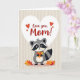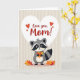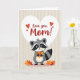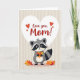 This card features an anthropomorphic forest creature centered on the front, drawn in charcoal gray, creamy white, and deep black, with distinctive eye markings and a striped tail that gives it a gentle, friendly look. It stands upright and holds a small bundle of golden and fiery orange leaves mixed with bright red berries, like a shy offering to someone special ❤️. Above the creature sits a large white heart shape that immediately draws the eye and sets a romantic, caring tone. Inside the heart, the main message appears in rich red text, placed neatly in the middle, with a few tiny red hearts floating nearby. The background stays simple with soft beige tones and subtle horizontal striping, keeping the focus on the character and its gift. Warm autumn colors in the leaves and berries contrast against the muted creature and background, adding a cozy, affectionate feel 🌼. A crisp white heart hovers over the character against the beige striped backdrop, while red lettering and small red hearts sit inside it.
