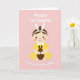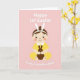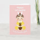 This card shows a simplified illustration of a baby with soft, rounded features, sitting calmly against a pastel pink background 🌷. The child wears a white headband with tall bunny ears 🐰 and a bright yellow outfit with a white collar, giving the scene a sweet, friendly energy. Wide dark eyes, a small curved smile, and rosy cheek dots create a gentle, affectionate look, like the baby is quietly sharing the moment with someone close. Resting in the baby’s lap is a small chocolate-brown bunny figure, held carefully as if it’s a treasured little companion. Above and below the central figure, softly rounded white lettering frames the message, with the top line arcing lightly and the bottom line balancing the layout. The overall palette stays light and soothing, with the yellow clothing standing out warmly against the pink backdrop and the darker bunny adding contrast. At the bottom, the baby’s tiny feet are drawn with small red dash marks for toes, splayed outward in a simple, endearing pose.