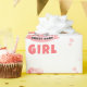 Adorable baby shower invitation featuring a cute baby elephant holding pink heart-shaped balloons, surrounded by delicate stars. The soft watercolor-style design in pastel pink and gray creates a sweet and dreamy atmosphere, perfect for celebrating the arrival of a little one. A lovely pink ribbon banner at the bottom provides space for customization, making it ideal for a baby girl’s shower.