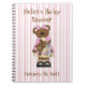 Sweet baby shower notebook done in a pink and white striped background, with adorable graphics of a brown teddy bear mommy, holding a baby teddy bear. Brown text is fully customizable to suit your shower needs. Great for guests to write special notes to the mom to be and for listing the gifts received. Personalize for your baby shower.