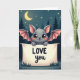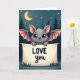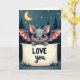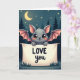 At the center of the card is a cute, stylized bat in soft gray, with big amber eyes and a gentle pink blush on its cheeks. Its wings stretch wide in a light pink shade, with faint vein details that make them feel soft and tender. The bat holds up a creamy banner with small rounded paws, and it reads “LOVE you” in dark lettering that looks like casual hand lettering across the middle. Behind it is a quiet night forest in deep indigo and teal, with shadowy pine trees along the horizon. A golden crescent moon sits in the upper left, and tiny stars are scattered across the sky like little dots of light. Near the bottom, a few bits of foliage glow softly, adding a calm, cozy touch to the scene. It feels meaningful because the message is simple and direct, and the bat’s sweet expression makes it easy to give with affection to a partner or a close friend 🥰❤️. Hope it helps you share Valentine’s Day sentiments with someone you care about.