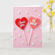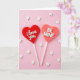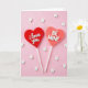 This card shows two heart-shaped lollipops on thin white sticks against a soft pink background. The left heart is a shiny deep red and it reads “i love you” in raised white cursive letters across the center. Next to it, a second heart in a peachy coral color says “BE MINE” in raised white all-caps letters. Both hearts tilt slightly, which makes the layout feel relaxed and sweet. Small white five-pointed stars are scattered around them, like little sprinkles floating in the air. The lighting is gentle and even, so the hearts look glossy and the stars look soft and smooth. Overall, it feels like a simple, happy way to say you care 💕❤️.
