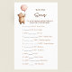 Add a touch of sweetness to your baby shower with this delightful 'Name That Song' game. The design showcases a charming teddy bear clutching a soft pink balloon, setting a gentle and joyful mood for your celebration. This interactive game challenges your guests to recall song lyrics, specifically those containing the word 'baby,' providing hours of entertainment. The elegant typography and subtle color scheme make this game card a beautiful addition to any baby shower decor. Make your baby shower unforgettable with this unique and engaging activity that everyone will love participating in.