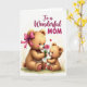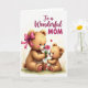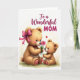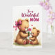 This greeting card shows two sweet, stylized bear characters sharing a gentle Mother’s Day moment, with the larger one wearing a bright pink bow as she leans in toward the smaller bear. The smaller bear offers a tiny bouquet of soft pink daisy-like flowers, and their rosy cheeks and close, tender gaze suggest a loving bond ❤️. Their warm brown fur looks plush and softly shaded, with light highlights that add depth without feeling busy. A small patch of green grass sits along the bottom edge, grounding the scene like they’re settled together in a quiet meadow. Near the top, a berry-colored message of appreciation is placed in flowing lettering, centered above the characters for easy reading. A small red heart floats nearby, adding a simple romantic touch to the space 🌼. Behind them, the background stays pale and softly glowing, keeping attention on the bow, flowers, and their affectionate expressions. The bouquet’s thin green stems and clustered pink petals sit between them, angled slightly upward toward the larger bear’s chest.
