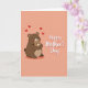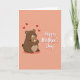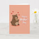 This card shows two rounded bear-like characters in soft brown tones, with the larger one on the left wrapping its arms around a smaller one tucked close to its chest, creating a tender, close moment ❤️. Their cheeks have gentle pink blush, and their simple faces lean toward each other as if sharing quiet affection. A smooth pastel peach background keeps the scene calm and cozy, with a faint shadow under their feet to ground them. Three small red hearts with thin white outlines float above the pair, adding a light, affectionate touch. On the right side, a short message appears in flowing cursive-style lettering, set in a darker brown that stands out against the peach. The text is stacked with generous spacing, leaving plenty of open area between the words and the hugging figures. Small highlights along the bears’ rounded edges suggest soft light, and the overall layout feels balanced and gentle 🌼. The three hearts hover just above the larger bear’s head, slightly angled as if drifting upward.