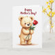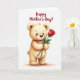 This card shows a cuddly, bear-like character centered on a bright white background, facing forward with a gentle, affectionate gaze ❤️. Its fur is a light golden-brown with soft shading, and its wide black eyes, tiny dark nose, and faint rosy cheeks give it a tender, friendly look. Rounded ears and softly curved arms and legs add to the cozy, huggable feel, as if it’s leaning in to offer a quiet moment of care. In its front paws, it holds a single red rose with layered petals, the deep crimson standing out against the warm fur while the stem and leaves sit in a dark leafy green. The pose makes the rose feel like a small romantic or appreciative gift, held carefully rather than waved around. Near the top, the phrase “Happy Mother’s Day!” is placed above the character in deep red lettering, clearly separated from the main image for easy reading 🌼. A faint wash of color beneath the feet suggests a soft ground shadow, while the rest of the background stays open and white. The rose’s petals show subtle highlights and darker folds, giving the bloom extra depth against the simple backdrop.