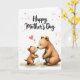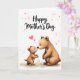 This card shows two bear-like characters in warm caramel and cocoa tones, standing close as the larger one gently touches noses with the smaller one in a quiet, affectionate moment ❤️. Their soft shading gives them a plush look, and their small curved smiles suggest calm closeness and trust. The background is plain white, keeping all attention on their faces and the gentle pose. Near the top, the words “Happy Mother’s Day” appear in flowing black lettering, centered above the pair. Light pink speckles float across the upper area like drifting petals, adding a sweet, airy feel. Three small pink hearts hover above the smaller character, hinting at a loving bond without needing extra words 🌼. Along the bottom edge, a faint strip of muted green grass sits beneath their feet with a lightly textured look.