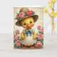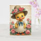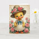Designed with a sunny yellow, duckling-like character centered in the scene, the artwork draws you in with a direct gaze that feels like a friendly hello 🐇. It wears a cream dress trimmed with delicate white lace, and a teal bow at the collar adds a sweet touch, like a small gift between close friends. A wide-brimmed hat in warm earthy tones sits on its head, decorated with pink and coral roses and leafy greens, giving the character a softly romantic, dressed-up look 🌷. Large blue eyes with fine lashes, a hint of rosy blush, and an open-mouthed smile suggest an inviting, affectionate expression. Bright orange webbed feet peek out beneath the hem, keeping the pose grounded and gentle. Around the figure, layers of soft pink roses and deep green foliage form a floral frame that feels like a garden moment shared together. Faint decorative lettering appears in the background like old parchment, and there is no main message printed across the front. The roses cluster thickest along the lower corners, with petals shaded from pale blush to deeper coral near the edges.