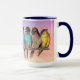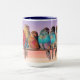 The front of this mug features a vintage illustration of sweet little birds, recreated digitally by me into a colorful artsy style, on a sunset ombre background. the inside of the cup and handle are a purple color, however the handle and inside color can be changed if desired.