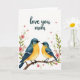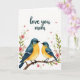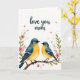 Designed with a bright white background, the card centers on two small birds perched on a sturdy brown branch, leaning toward each other with a tender, protective closeness ❤️. Their feathers shift from deep blue on the back and wings to sunny yellow on the chest, with small white accents and dark markings around their eyes that make their gaze feel gentle and attentive. Around them, green leafy sprigs rise from the lower sides, dotted with soft pink blossoms that curl upward like a quiet garden frame. Tiny heart shapes float lightly near the birds, adding a romantic, affectionate touch without crowding the scene. Near the top, a short message is placed in dark teal lettering, spaced so it sits clearly above the illustration. The composition keeps plenty of open space, letting the birds and flowers feel airy and calm, like a fresh spring morning 🌼. Small earthy brown specks are scattered across the white background, mostly around the middle and lower area.