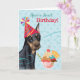 Happy birthday greetings with this cute design featuring a happy party-wearing Doberman Pinscher with an ice cream sundae. Text can be easily changed; just click on customize button.