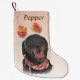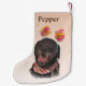 Perfect! Exactly what I ordered! I uploaded a picture of my blue chow, and the screen print was incredible. the back side of the stocking was the red and black checkered print. my puppy's name was also printed on the cuff of the stocking. PERFECT! Highly recommend this product! My puppy's name was screen printed onto the cuff of the stocking, the font was perfect!