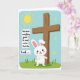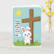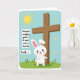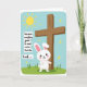 This card features a simple digital illustration with a tall wooden cross in earthy brown standing along the right side, and a small white bunny cuddled at its base with pink-tinted ears and rosy cheeks 🐰. The bunny’s wide eyes and slight blush give it a tender, affectionate look, like it’s quietly keeping close to something it trusts. A round yellow sun sits high in a soft blue sky, with small yellow triangle shapes scattered around like little rays. The ground is a smooth green field with a few short grass marks, keeping the setting calm and outdoorsy. On the left, several stacked white rectangles hold the message in dark lettering, arranged in short lines so it reads like a note posted in the scene. The text says, “because everything good & sweet comes from the Lord…,” and it stands out clearly against the white shapes. A few tiny yellow triangles float between the sun and the sky, while the bunny rests beside the cross with its ears angled slightly upward 🐇.