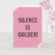 Designed with a soft pastel pink background, this card centers a calm saying in a way that feels gentle and a little affectionate ❤️. The main text reads “SILENCE IS GOLDEN!” stacked vertically down the middle in large, dark serif letters that stand out clearly. Each letter has a lightly speckled, glitter-like texture, giving the type a tender, cared-for look rather than a flat print. A crisp white frame surrounds the pink field, and within that border sits a neat pattern of small white polka dots that adds a light, friendly touch 🌼. In the top-left corner, a partial white flower with a bright yellow center leans into the border as if peeking in. In the bottom-right corner, a matching white flower mirrors it, balancing the layout. The text remains centered and dark against the pink, while the border stays white with evenly spaced white dots and the two corner blooms.