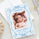 This sweet birth announcement features one vertical photo with a blue hand-drawn ribbon frame and light blue gingham pattern background. You can easily add another photo and text to the back if needed.