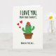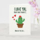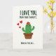 This card shows an anthropomorphic green desert plant standing in a rust-colored pot on a soft cream background, with tiny black spines that contrast nicely against its smooth shape. Its round eyes look gently to the side, and a small pink mouth with a little tongue peeking out suggests a shy, flirty confession ❤️. A single red flower with a bright yellow center sits on top like a sweet accent, adding a romantic touch to the character’s bashful expression. Three red hearts float upward along the left side, as if drifting from the plant toward someone just off the card. Dark green text sits at the top in two short lines, centered above the character, setting up the affectionate message. A second line of dark green text appears near the bottom, centered under the pot, delivering a cheeky contrast that feels like friendly teasing between close partners 🌼. The layout stays minimal with lots of open space, and the hearts are arranged in a rising diagonal along the left margin.