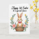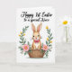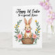 Designed with a soft watercolor look, this artwork centers on a fawn-colored bunny with long ears, rosy cheeks, and a tiny nose, wearing a small pink bow 🐰. The bunny sits snugly in a woven basket, like it’s been gently tucked in by someone who cares. Around it, a curved wreath of spring plants forms a tender frame, with lush green leaves and scattered blooms that seem to lean toward the bunny like friendly company 🌷. Bright yellow bell-shaped flowers mix with wide pink blossoms with sunny centers, plus small white daisy-like accents for contrast. The background stays white so the pastel tones and greens stand out, keeping the scene airy and calm. Near the top, a flowing message line appears in a dark gray tone, centered above the wreath. The basket shows crosshatched texture, and the wreath arches from one side to the other in a neat curve.