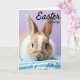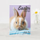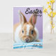 This card shows a close, head-on photo of a small domestic rabbit 🐰, its face filling the center with a gentle, inviting gaze that feels like a quiet hello between friends. Its fur is bi-colored in warm caramel and white, with tall upright ears that frame deep blue eyes catching a soft glint of light. A tiny pink nose and long fine whiskers add delicate detail, as if the bunny is leaning in for a closer look. The lighting is diffused and soft, smoothing the shadows and bringing out the plush texture of the coat. Behind the rabbit is a blurred pastel lavender background that keeps the focus on its tender expression. Along the top, the words “Easter Greetings” appear in flowing, cursive-style lettering in a dark tone, while “Little One” sits centered near the bottom in the same style. A blue-and-white striped fabric runs beneath the bunny, adding crisp lines and a cozy, nest-like base 🌷.